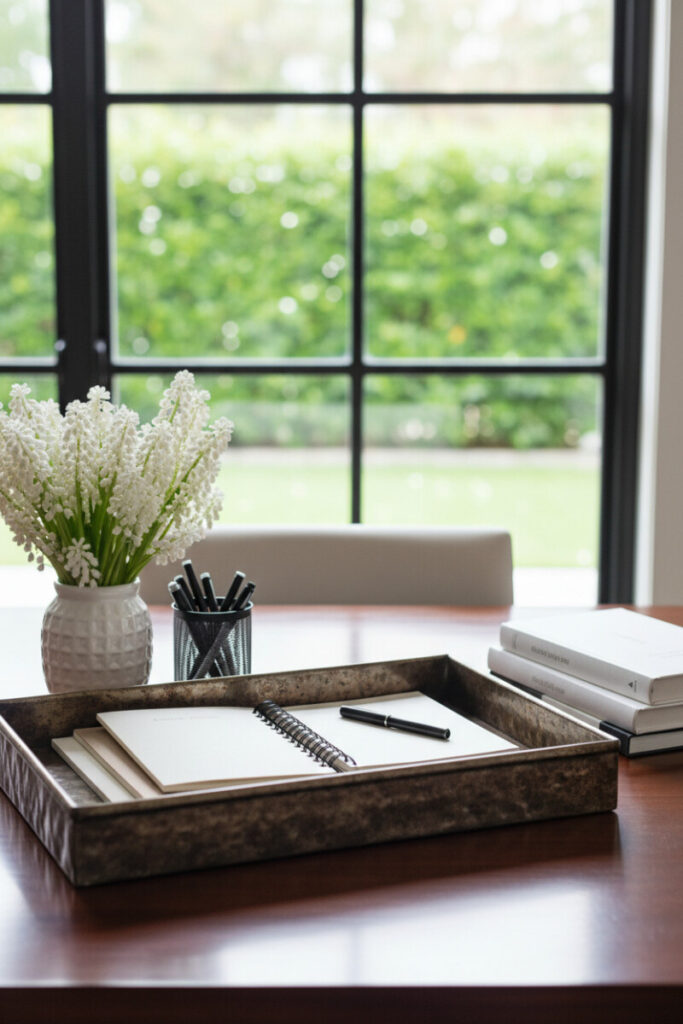 An oxidized bronze tray corrals notebooks, a planner, and pens while leaving the desk visually calm. Add a textured vase of grape hyacinths and a wire mesh cup for tools. These Tray Decorating Ideas work because they impose boundaries—papers go inside, not everywhere. Slide the tray toward you during work sessions and back to the corner when you want a clean surface. If you’re hybrid-working, label the notebook spines outward so tomorrow’s you can find things at a glance.