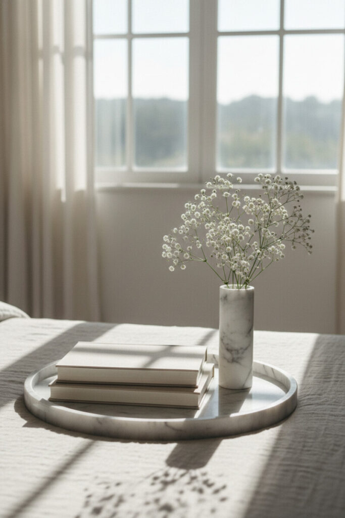 A round, grey-veined marble tray placed on rumpled linen says “Sunday morning” in the best way. Stack a few neutral-hued books and slip in a slender vase with airy blooms. Backlighting creates soft silhouettes and a calm, high-key vibe. For small bedrooms, this is how to style a tray on a coffee table—translated to the nightstand: curate, edit, and leave white space around the vignette so it can breathe.