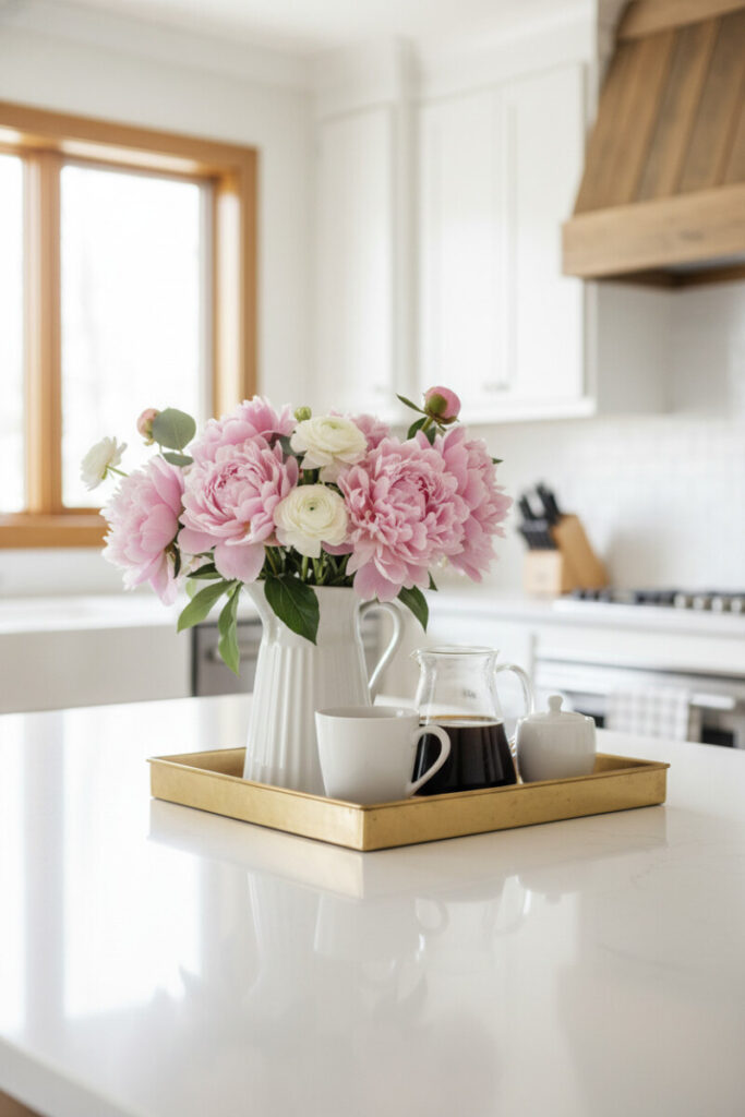 Breakfast becomes a ritual when a brass tray holds a porcelain pitcher of peonies, a mug, a carafe, and a sugar pot. The trick is proportion: use a tray that is at least half the width of your island so the vignette reads intentional, not accidental. These Tray Decorating Ideas are ideal for open-plan homes—the metallic accents echo appliance hardware, unifying the room.