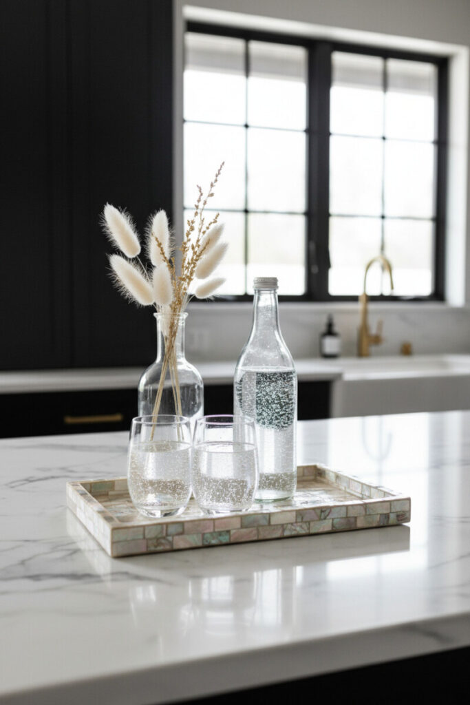 Iridescent nacre turns glassware into prisms. On a mother of pearl tray, tall bottles and sparkling water glasses catch backlight and scatter it. Keep the rest of the kitchen matte—charcoal cabinetry, black windows—so the tray feels like the sunniest spot in the room. Style with dried botanicals in a bottle for height. This is a masterclass in material contrast and a subtle nod to coastal style.