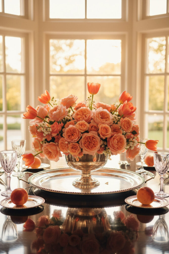 For grand dinners, nothing outshines fluted silver and a mountain of roses and tulips. Set the footed urn in the center of a large silver tray; the double layer of shine echoes candlelight and elevates the table. Scatter a few peaches or apricots on tiny plates for a tonal pop that also hints at dessert. These Tray Decorating Ideas encourage dramatic scale—don’t be shy with fullness, especially under strong backlight.