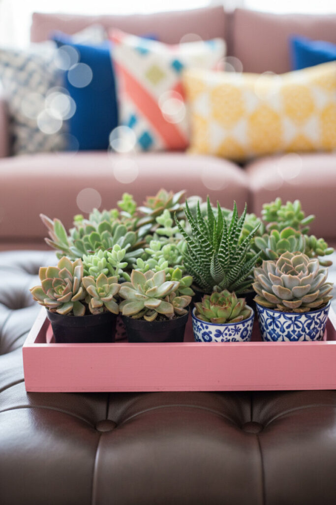 A magenta tray on a tufted leather ottoman is the poster child for playful coffee table tray decor. Use a mix of tiny black nursery pots and patterned ceramics for visual rhythm, and cluster several succulent varieties so the heights step down like a skyline. Saturated pillows in the background can pick up the tray’s color, tying the seating area together. Mist lightly and rotate the plants toward the window to keep them perky.
