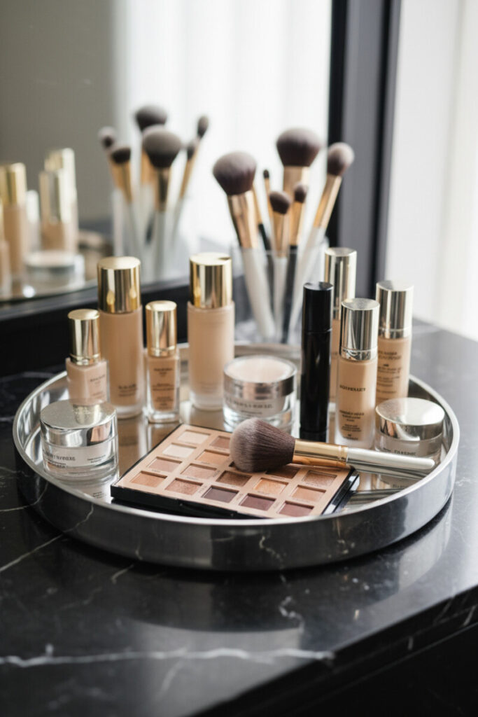 A chrome tray turns everyday cosmetics into a boutique display. Lay a neutral eyeshadow palette at a diagonal and tuck a fluffy brush partly across it. Surround with foundation bottles and pumps, keeping the tallest to the rear. In vanity tray styling, reflective materials do double duty by brightening dark stone counters. If you share the space, use trays to split zones—your items left, theirs right—so mornings run smoothly.