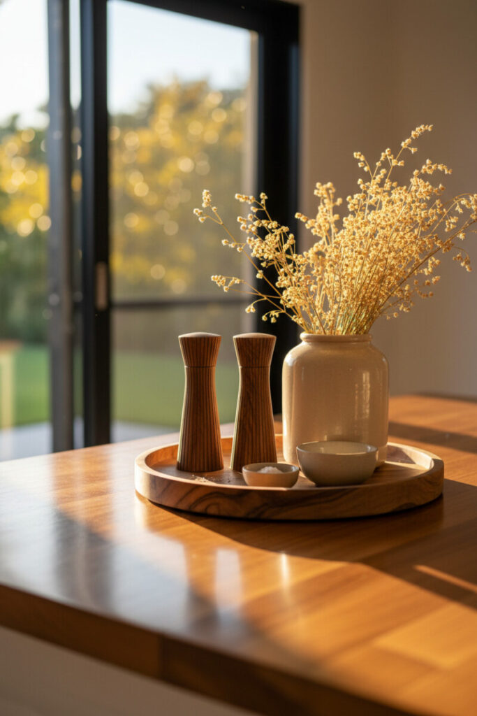 Wood on wood can be gorgeous with the right contrast. A round teak tray on a honey-toned counter carries grinders, a jar of dried grasses, and small condiment bowls. Position it near a window so golden hour does the heavy lifting: the shadows add drama, the grains glow. These Tray Decorating Ideas are work-forward: when it’s time to wipe down, lift one tray rather than twelve loose pieces.