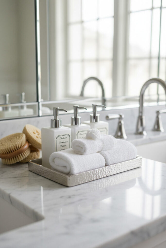 Welcome guests with crisp towels, labeled pump bottles, and a natural bristle brush set on a hammered silver tray. The monochrome palette—white, silver, marble veining—reads spa-level clean. This checks the box for bathroom tray ideas for guests: everything is intuitive (soap here, lotion there), and the tray edges keep water from wandering. A mirrored backdrop doubles the light and gives the display an extra sparkle.