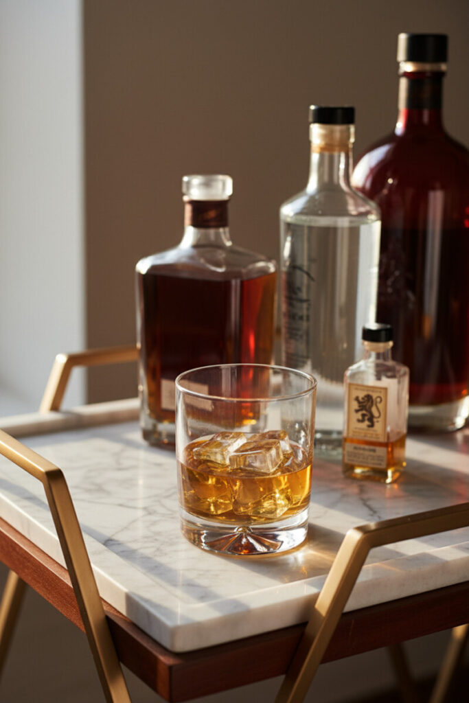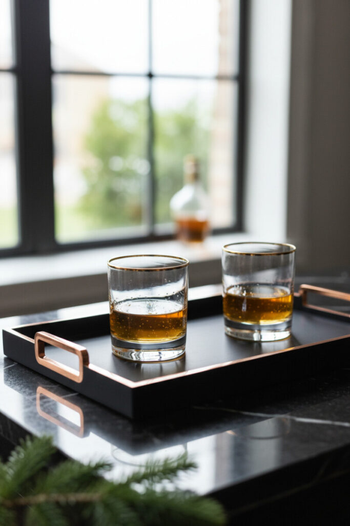 A sleek matte black tray with copper edges makes simple whiskey glasses feel special. Backlighting from a window will set the amber liquid glowing while the gold rims pick up the metallic trim. Group glassware in pairs and let a single evergreen sprig or a bottle silhouette peek in the background for depth. These Tray Decorating Ideas lean into contrast: black marble, onyx tray, luminous liquor. Keep coasters close, and if you host often, add a small dish of citrus peels to perfume the scene.