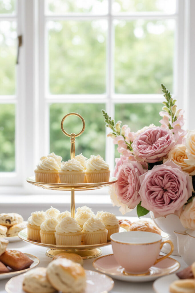 Afternoon tea calls for levels. A two-tiered brass cake stand loaded with mini cheesecakes and cupcakes becomes the sculptural heart of the scene, flanked by a lush bouquet of garden roses. Scatter a few pastries around the base like “fallen leaves” to connect the vertical pedestal to the flat tabletop. These Tray Decorating Ideas thrive in bright daylight; the soft shadows and gold highlights read delicious even before the first bite.