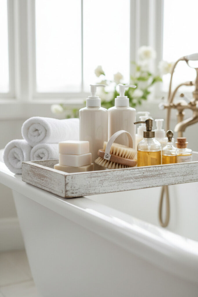A whitewashed wooden tray perched on a tub edge evokes boutique spa energy. Stock it with lotion pumps, artisan soap bars, a small massage brush, and tiny vials of golden oils—some with corks, one with a vintage pump. The color story is creamy white plus warm amber, instantly calming. For bathroom tray ideas for guests, add a note card: “Help yourself.” Keep the tray wide enough that a book or tea cup can co-star during long soaks.