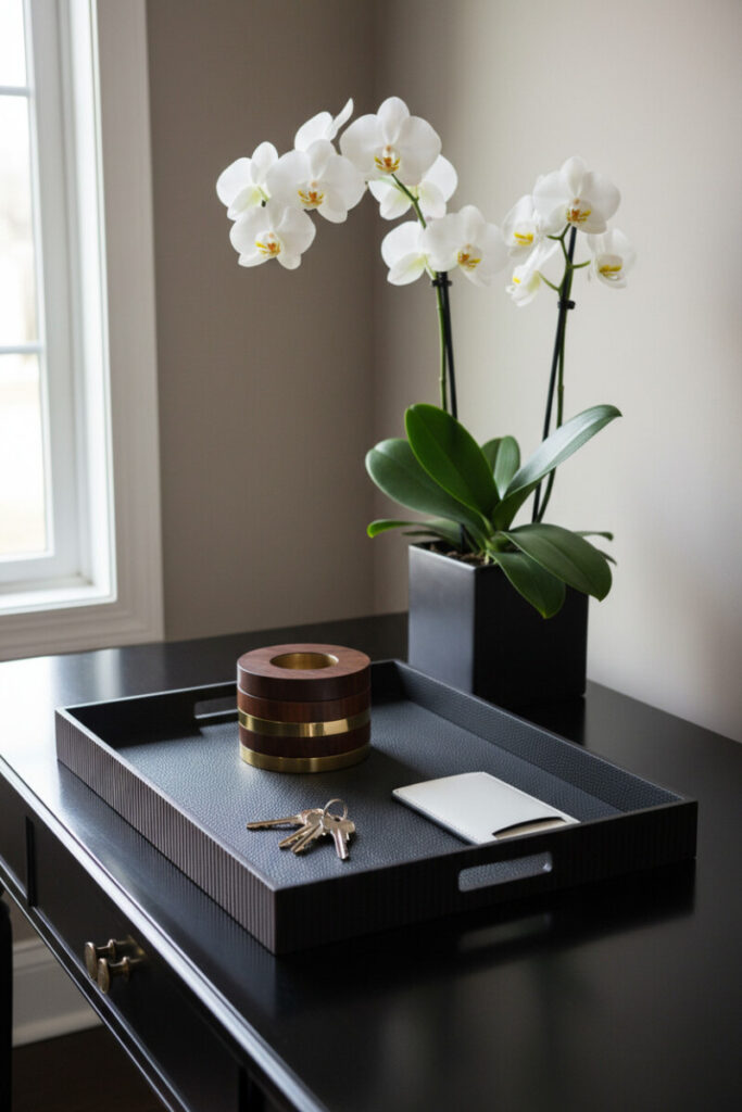 A dark espresso tray with a leather insert corrals grab-and-go items at the door: keys, a banded wood-and-brass trinket cup, and a slim card holder. A potted orchid elevates utility into styling, its glossy leaves echoing the tray’s sheen. The best Tray Decorating Ideas solve daily friction. If you’re always hunting for keys, this tray is your new ritual—empty pockets here, and nowhere else.