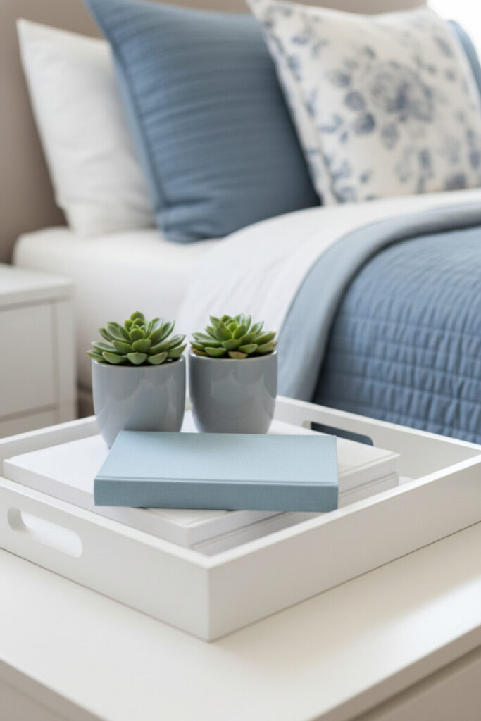 A crisp white wooden tray on a nightstand creates a quiet “landing pad.” Layer white decorative books with a pale blue journal on top, then nestle two small Echeveria in dove-gray pots. The color story—soft blues, creams, and greens—encourages rest. These Tray Decorating Ideas are also practical: the tray’s lip keeps lip balm and pens from rolling when you reach for the lamp at 2 a.m.