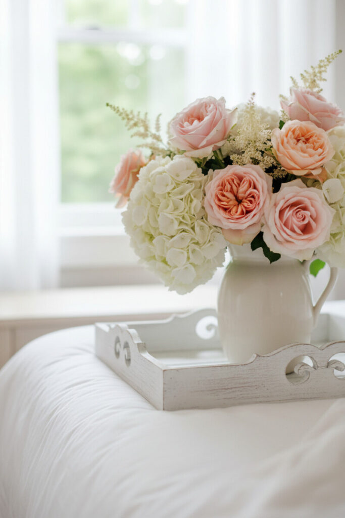 An ornate white tray with cut-out edges hosts an ivory pitcher brimming with hydrangeas, blush roses, and feathery astilbe. This is bedtime luxury distilled. Keep the palette high-key (white, cream, soft salmon, muted green) so the arrangement glows in morning light. For longevity, mix a few faux stems with fresh flowers; you’ll keep the fullness while reducing upkeep.