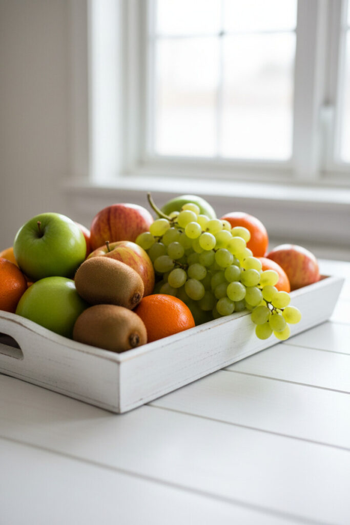 A farmhouse breakfast table comes alive with a white tray overflowing with apples, tangerines, and a bright cluster of grapes. Backlighting makes fruit skins look lacquered. For family homes, this is functional decor—if healthy snacks are in easy reach, they’re more likely to be eaten. These Tray Decorating Ideas also photograph beautifully for seasonal posts: switch in pomegranates in winter, peaches in summer.