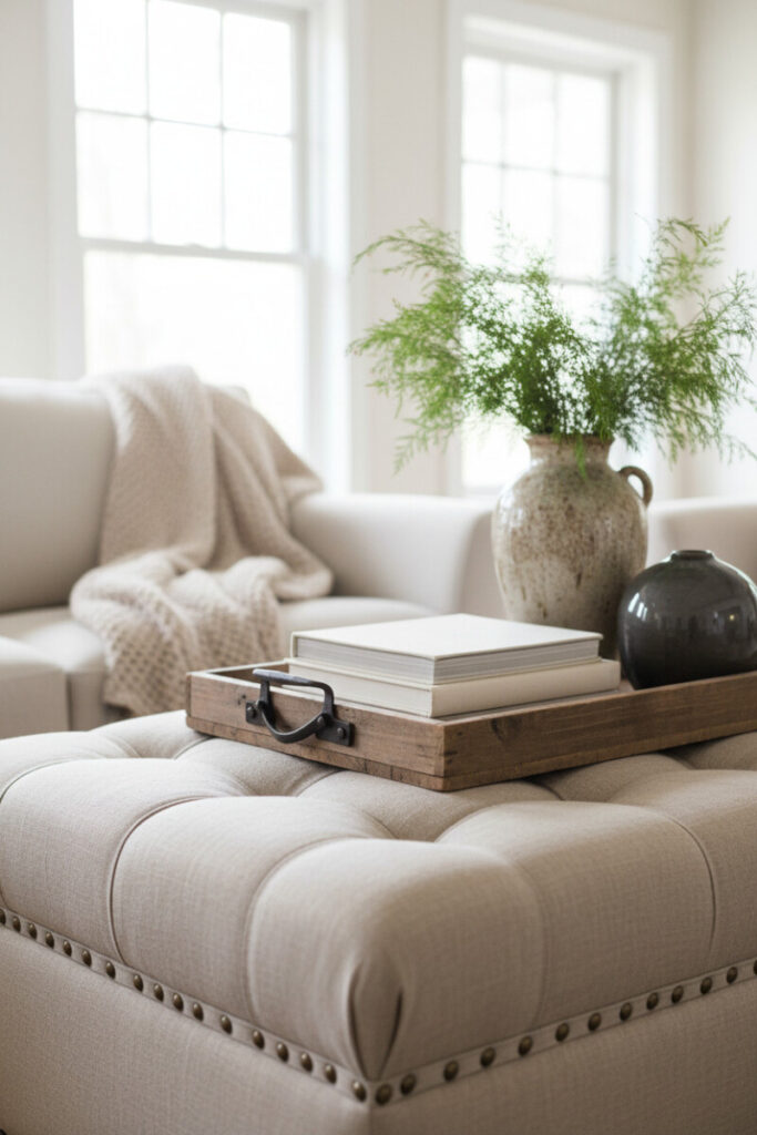 When you’re short on flat surfaces, a tufted linen stool becomes a coffee table substitute. A dark wooden tray with metal handles carries thick neutral books, a vintage vase of ferns, and a small charcoal sphere for contrast. Nailhead trim around the stool adds subtle shine. In rooms that lean neutral, green foliage is your color—fresh, lively, and zero commitment to a new paint color.