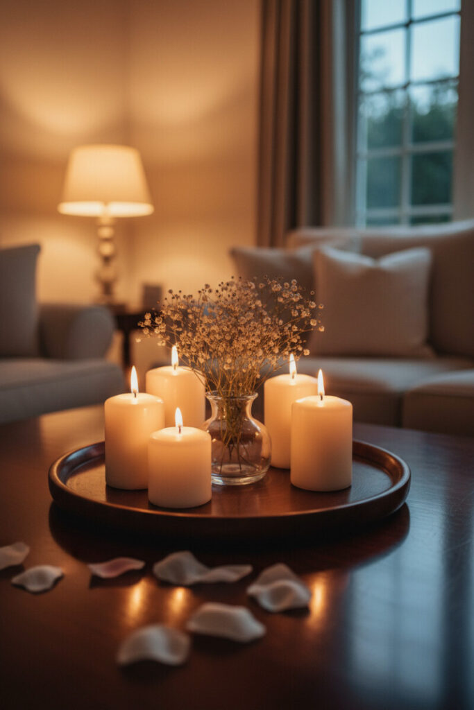 Nothing softens a room faster than candlelight. Anchor a circle of pillar and votive candles on a dark wooden tray, then tuck in a tiny vase of baby’s breath. Petals scattered on the table top add a poetic echo. For safety, vary heights but maintain a tight cluster so wax drips stay inside the tray. In a dim corner, this is powerful coffee table tray decor: it brings glow to low light, and the round shapes cinch a room’s softer lines.
