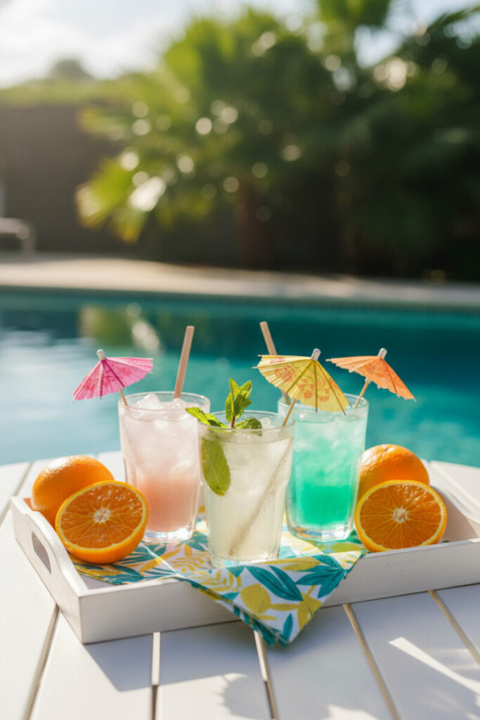 Summer entertaining is a vibe—and a white slatted tray stacked with tropical drinks nails it. Think pink lemonade, clear fizz with mint, and teal cocktails topped with paper parasols. Add bright citrus halves for color and aroma. In strong sunlight, arrange glasses so no one casts shadows on another, allowing each to sparkle. Outdoor Tray Decorating Ideas should feel effortless; keep a towel under the tray to catch condensation.