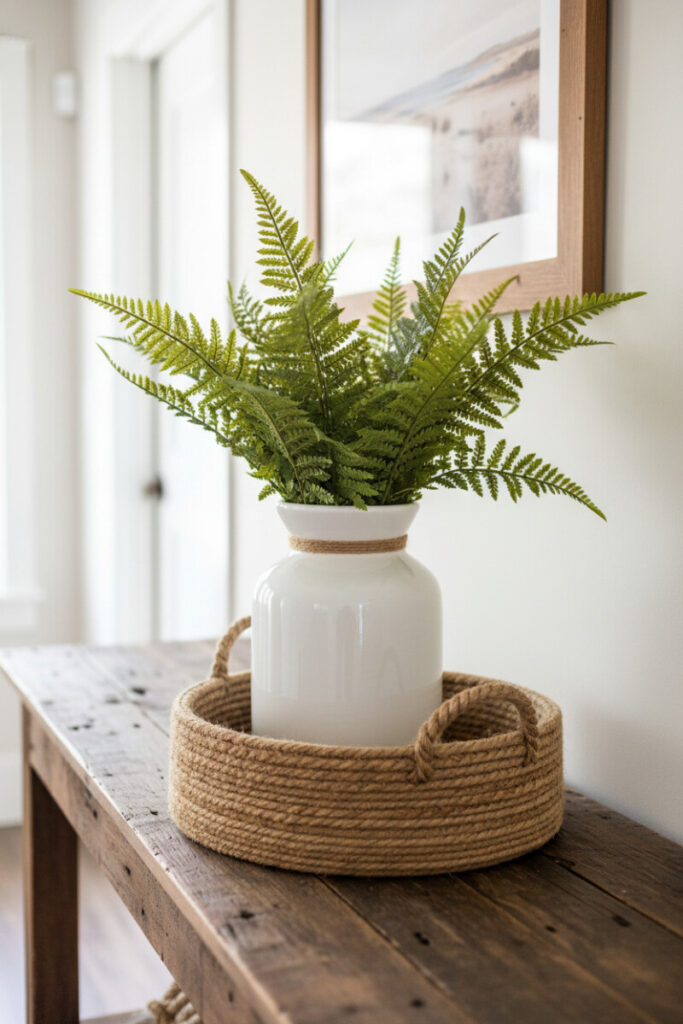 A thick jute rope tray brings beach-house charm to an entry console. Inside, a glossy white vase tied with twine holds faux ferns in varied greens. The rope’s deep texture and the distressed wood beneath create rustic layering. To adapt this to different seasons, swap greenery for olive branches in fall or eucalyptus in winter. This is a quiet, natural take on Tray Decorating Ideas that greets guests with ease.