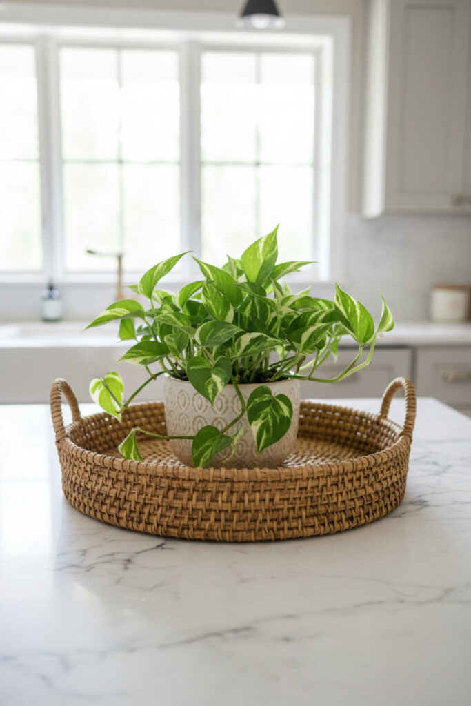 In a bright farmhouse kitchen, set a rounded woven tray on cool marble and center a lush pothos in a cream pot. The contrast—rough rattan against sleek stone—does all the design work for you. Thread the plant’s tendrils around the tray’s edge so the vignette feels organic rather than staged. This is a perfect example of how to style a tray on a coffee table transferred to the island: one hero plant, one beautiful container, one tactile base.