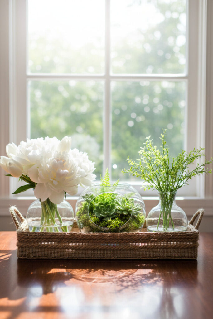 Finish with a soft showstopper: a burlap-and-jute tray set in front of a sunny window, holding a mossy terrarium flanked by two glass vases—one with layered white peonies and tulips, the other with airy green sprigs. Backlighting turns water into diamonds and leaves into stained glass. It’s a serene, living centerpiece that shifts gently throughout the day as the sun moves.