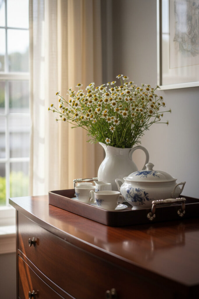 A polished sideboard becomes an instant hospitality station with a dark wood tray and a vintage tea set. Mix gleaming porcelain with a bouquet of feverfew—those sunny centers read friendly rather than formal. In this kind of Tray Decorating Ideas, reflective surfaces are your allies: the shine of the tray, the gloss of the pitcher, and the glint of silver handles visually link pieces. Keep a folded linen nearby to soften the look and to protect the wood.