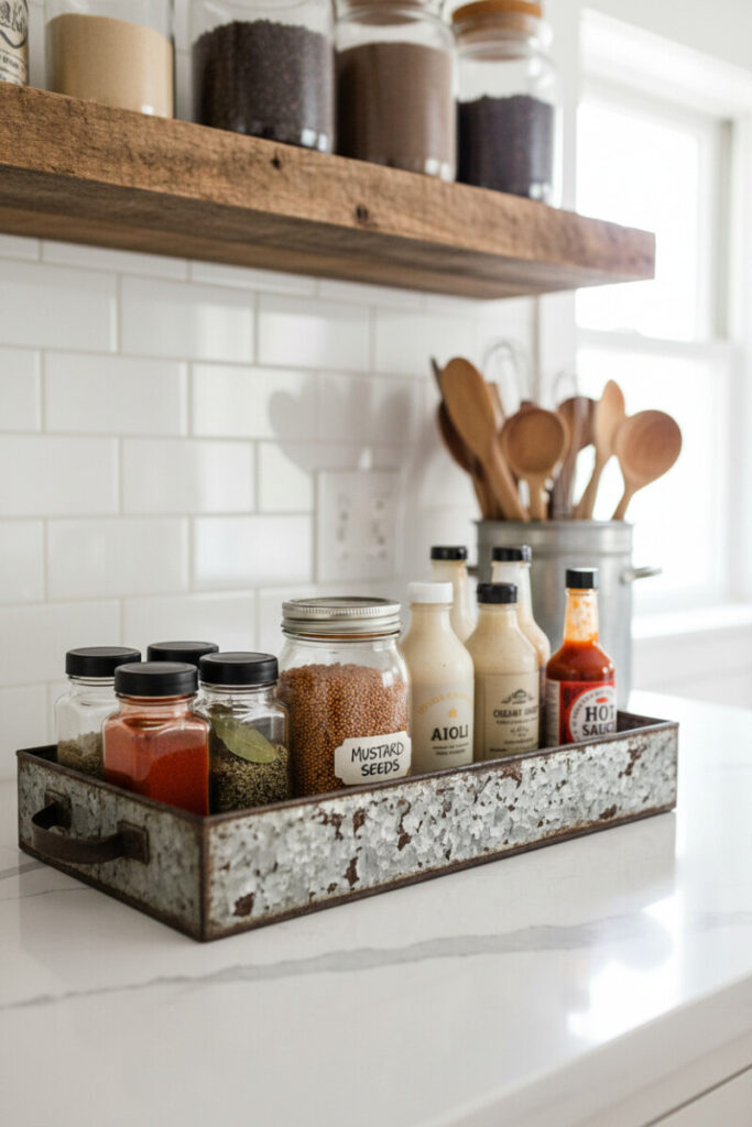 Galvanized metal is the stylish workhorse of farmhouse kitchens. Fill a distressed steel tray with spice jars, oils, and a jar of eye-catching mustard seeds. The aged finish plays beautifully against smooth glass and a crisp quartz counter. If you cook daily, this is functional styling: everything within reach, nothing cluttered. These Tray Decorating Ideas keep cleanup fast—slide the whole unit away when you need the counter. Use odd numbers (3, 5, 7) when grouping bottles to keep the arrangement lively.