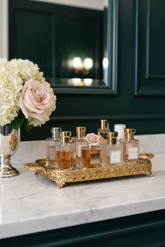 In the realm of vanity tray styling, a gold-gilded piece turns perfume into sculpture. Cluster bottles by shape and height and insert one “hero” bottle—perhaps with a blush rose detail—to create a focal point. A small bouquet of hydrangea and a pale pink rose in a silver vase balances the metallics with softness. Mirrors or dark paneling behind the setup amplify sparkle. This is one of the Tray Decorating Ideas where less is more: decant extraneous lotions elsewhere to keep the display airy.