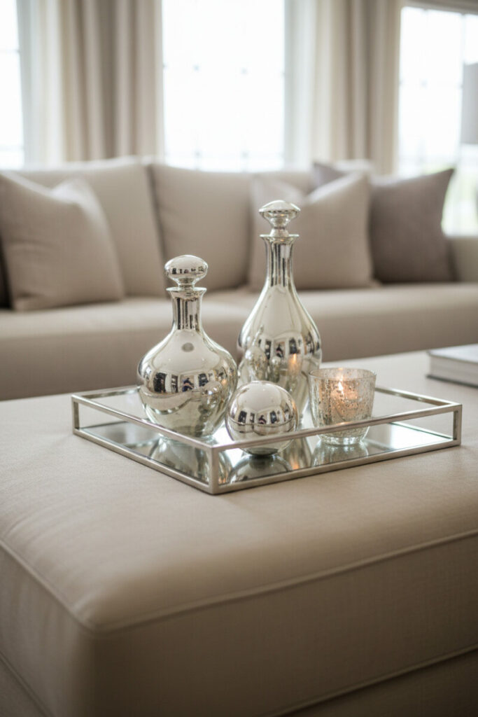 A silver-framed glass tray offers mirror-like reflections that read crisp and cool. Two mercury glass decanters, chrome spheres, and a speckled candle become a mini-gallery on your upholstered coffee table. For coffee table tray decor, this approach shines in neutral rooms: the silvery palette introduces shine without noise. Ensure candle flames sit clear of soft furnishings by using low votives and fire-safe holders.